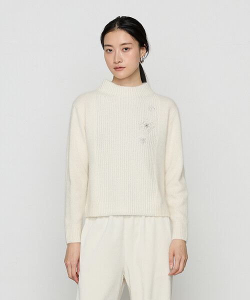 《デザイン》ショートカーデ同様、ビーズ&スパンコールで描いた雪の結晶が美しい、アクセサリー要らずの華やかなボトルネックセーターです。フロントから編み続きのボトルネックはローゲージで編んでいるのできれいに立ち上がって見た目も暖かです。脇から後ろ身頃とお袖は無地ですっきり・薄地の天竺で着ぶくれの心配はありません。雪柄刺繍がパーティームードを盛り上げる、年末年始のお食事会にもおすすめの一枚です。《素材》チャイニーズラクーンと言われるタヌキの毛とアンゴラ、さらにラムウールを混紡した柔らかな毛足と柔らかさが特長の糸です。ラクーンはカシミヤの様な極細糸で毛足が長く、フェザーの様なふんわりした独特のタッチが魅力的です。アンゴラは美しい光沢がある柔らかな毛足で保湿性に優れています。それぞれの素材の良さをミックスした上質な素材です。