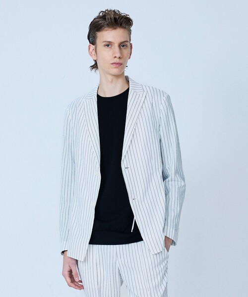 Dot Air Sucker Stripe Jacket 【素材】 東レのドットエアを使用。絶妙なメッシュが透けすぎず、春から夏まで長く着用可能な素材感です。 【デザイン】 細身でスッキリとしたバランスの良いジャケット。気分を高めてくれるストライプ柄もポイント。 【コーディネート】 同素材スラックス(02520052074)と合わせたセットアップスタイルがオススメ。