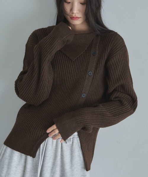 ◆Detail大きめなアシンメトリー襟ディティールがポイントのデザインニット。実際に開け閉め可能なボタンから伸びたスリットが大人の抜け感を発揮。ふんわりとした肉感のあるあたたかな風合いで、寒い冬にもピッタリな一着◎着るだけで着映える主役ニットは持っていると便利なアイテムです。◆Fabric---------------------------------透け感:なし伸縮性:あり光沢:なし生地の厚さ:★★★★☆---------------------------------※この商品は、素材の特性上、着用の際ピリング(毛玉)が発生する場合があります。ピリングは引っ張って取ろうとせず、小さなハサミや毛玉取り器などを使用し丁寧に取り除いてください。※汗や水、摩擦により他のものに色移りすることがありますのでご注意ください。濃色製品は色移りすることがありますので、他の物と分けて洗濯してください。※生産時期によりサイズや質感・色味に若干の個体差がみられる場合がございます。※商品画像は、光の当たり具合やパソコンなどの閲覧環境により、実際の色味と異なって見える場合がございます。予めご了承ください。※着用、お取り扱いの際は、商品についている品質表示とアテンションタグを必ずご確認ください。◆Information欲しいitemをお気に入り登録(♡マークをclick) ・お買いのがし対策…完売itemの再入荷やラスト1点の情報をお知らせ ・欲しいitemをお得にget…pricedownになったらいち早くお知らせ ・スムーズ検索…ZOZOのお気に入りアイテムページで簡単checkできるから、再検索不要♪
