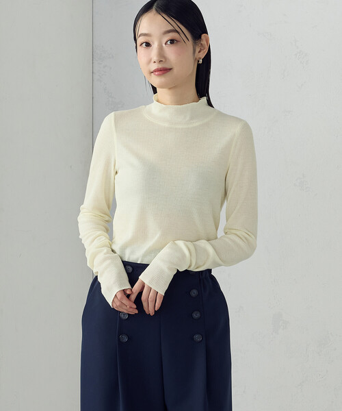 【宮城舞さん着用】《デザイン》素肌がほんのり透ける、シアーな透明感が印象的なハイネックカットソーです。繊細なリブ素材がフワッと肌になじむ1枚。コンパクトながらタイと過ぎないサイジングや長めの袖丈でこなれ感UP。そのままでももちろん、様々なアイテムのインナーとして、レイヤードが楽しめます。袖口と衿端、裾と袖付けに振りミシンをかけてアクセントを付けました。《素材》ふんわりと軽くてしなやかな手触りが特徴的でほんのりとした透け感のある繊細な印象のテレコ素材です。レーヨン特有のしなやかな風合いに、ナイロンの軽さと速乾性をプラスし、シワになりにくく伸縮性にも優れた素材です。……………………透け感:ややあり厚さ:やや薄手伸縮性:あり光沢感:なし裏地:なし洗濯方法:洗濯機(弱)OK※引っかけに注意してください……………………