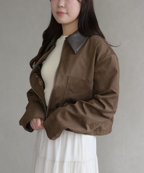 2025 Autumn&Winter Item異素材配色がポイントのショートブルゾン【 design 】襟と袖口に異素材を切り替えた、アクセントの効いたショートブルゾン。落ち着いたマットな質感のボディに、レザー調パーツを組み合わせることで大人カジュアルなムード漂う1枚に仕上げました。フロントはジップ仕様で着脱しやすく、大きめポケットが実用性もプラス。秋冬のスタイリングを引き締めてくれる主役アウターです。【 styling point 】デニム合わせでカジュアルにまとめるのはもちろん、スカートと合わせればフェミニンMIXな着こなしに。ショート丈なので、ハイウエストボトムと合わせれば脚長効果のあるバランスの良いシルエットが完成。シンプルなインナーでも様になる、取り入れやすい万能ブルゾンです。※ご覧のモニター環境や光の照射・角度により、画像の色味と多少異なる場合がございます。ご了承ください。----------------------------透け感 [なし]裏地 [なし]伸縮性 [なし]生地の厚さ [ふつう]----------------------------【 お買い物をお楽しみいただく為に 】▼お気に入り登録をオススメします。 『♡』をクリックすると…・《商品のお気に入り登録》で再入荷通知や ラスト1点の通知、セールやクーポンの通知も 受け取ることができます。・《ブランドのお気に入り登録》で新作商品や再入荷など、 お得な情報を受け取ることができます。