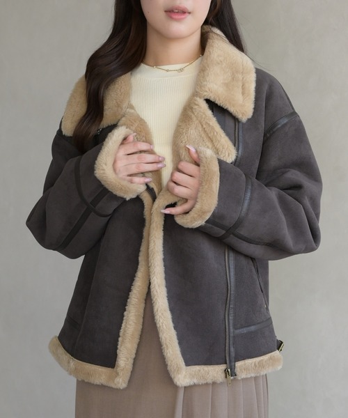 2025 Autumn&Winter Item存在感抜群のムートンライクボアジャケット【 design 】ボリュームのあるフェイクムートン×ボアの切り替えが目を惹く、冬の主役になるショートアウター。大きめの襟とフロントの太めラインが顔まわりを華やかに見せ、羽織るだけでコーデを一段格上げしてくれます。袖口にもふわふわのボアをあしらい、暖かさとデザイン性を両立。しっかりとした素材感で、寒い季節に頼れる1着です。【 styling point 】デニムで気負わない大人カジュアルに仕上げるのはもちろん、スカートやワンピースに合わせてフェミニンに着こなすのもおすすめ。ボリューム感があるので、ボトムはすっきりシルエットを選ぶとバランスよくまとまります。一枚で“高見え”する、冬映えアウター。※ご覧のモニター環境や光の照射・角度により、画像の色味と多少異なる場合がございます。ご了承ください。----------------------------透け感 [なし]裏地 [なし]伸縮性 [なし]生地の厚さ [ふつう]----------------------------【 お買い物をお楽しみいただく為に 】▼お気に入り登録をオススメします。 『♡』をクリックすると…・《商品のお気に入り登録》で再入荷通知や ラスト1点の通知、セールやクーポンの通知も 受け取ることができます。・《ブランドのお気に入り登録》で新作商品や再入荷など、 お得な情報を受け取ることができます。