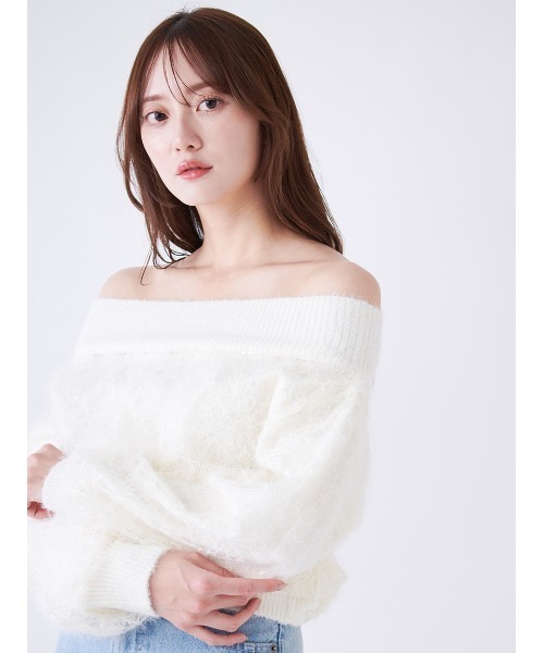 【レースアクセント オフショルニットプルオーバー】【Design/Styling】肩のリブがしっかりフィットし、安心して着られるオフショルニットです。ふわっとした糸のリブとレースが冬の女性らしさを演出。アウトでもバランス良く着られる丈感です。【Fabric】柔らかく表情のあるニット素材。アイボリー、ブラック、ライトブルーの3色展開。透け感;なし裏地;なし伸縮性;あり光沢感;なし生地の厚さ;やや厚手※照明の関係により、実際よりも色味が違って見える場合があります。またパソコン・スマートフォンなどの環境により、若干製品と画像のカラーが異なる場合もございます。予めご了承ください。商品の色味は、商品単品画像をご参照下さい。 ※商品画像はサンプルのため、色味やサイズ等の仕様に変更がある場合がございますので、予めご了承ください。