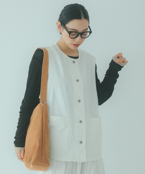 レイヤードしやすいオーバー感がポイント着回し力抜群なノーカラーデニムベストーーー【素材】10オンスくらいの重すぎない程よい厚みのデニムを使用。春から秋口にぴったりな程よい厚みのデニム生地なので、暖かい日も軽やかにご着用いただけます。【デザイン】すっきりとしたノーカラーのデニムベスト。ビッグシルエットのトップスや厚手のトップスにレイヤードしやすいオーバー感がポイントです。ノーカラーなので、インに合わせるアイテムを選ばず着回しのきく一枚◎定番のブルー、爽やかなホワイトは、新鮮な春の着こなしにぴったりです。デニム ベスト ジレーーー【スタイリング】春はレースや刺繍のブラウス合わせでレディライクに着こなすのが◎スウェットやボーダーTを合わせた思いきりカジュアルな着こなしはもちろん、ナロースカートや綺麗めパンツなどレディライクな外しアイテムと合わせるのも素敵に決まります。