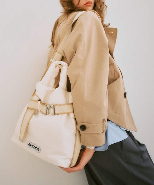 【2026 Spring】【26SS】 <POINT> ・ほどよいハリと微光沢のあるポリエステル素材で、カジュアルすぎず大人っぽい印象に ・ベルトテープ×バックルのデザインが、スタイリングのアクセントとして洗練された雰囲気 ・ショルダーにも、トートにもできる2WAY仕様で、ON/OFF問わず使いやすいアイテム 【デザイン・シルエット】 ややふくらみのあるフォルムに、微光沢の素材を組み合わせた上品カジュアルなデザインバッグ。フロントにあしらった配色テープとシルバーバックルがアクセントになり、シンプルなスタイリングにも映える仕上がりです。ベルトをキュッと締めると、口元がくしゅっと寄って女性らしい丸みのあるシルエットに変化。ショルダーと手持ちの2WAY仕様で、気分やコーデに合わせて持ち替えられる使い勝手の良さも魅力です。 【素材】 ブラックは、柔らかくしなやかな合成皮革を使用し、より大人っぽく上品な雰囲気に仕上げています。 OUTDOOR PRODUCTSでは、ALLブラック×合皮は初の展開! チャコールとキナリは、ほどよいハリと微光沢のあるポリエステル素材を使用。軽やかでデイリーに取り入れやすい質感です。 ※カラーによって組成が異なります。 ブラック(合成皮革):(表地) 合成皮革 (裏地) ポリエステル 100% (テープ部分) ポリエステル 100% チャコール、キナリ:(表地) ポリエステル 100% (裏地) ポリエステル 100% (テープ部分) ポリエステル 100% ----------------------------- ポケットの数:外0個、内1個 500mlペットボトル:〇 長財布収納:〇 A4収納:× ショルダー紐:あり(調節不可) ----------------------------- 【OUTDOOR PRODUCTS/アウトドアプロダクツ】 1973年Californiaで誕生したOUTDOOR PRODUCTS。 西海岸の匂いを感じさせる明るく元気なカラーリングをベースに、「機能性」「革新的なマテリアル」を有した商品を常に提案し続けます。 ※画像の商品はサンプルです。実際の商品と仕様、加工、サイズが若干異なる場合がございます。