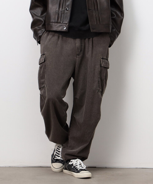 《デザイン》人気のオーバーダイのデニムでPURPLE&YELLOW定番のワイドカーゴパンツを作りました。ブラスト加工とオーバーダイ加工を施し、表情のある雰囲気に仕上げています。ブラスト加工をして色が落ちた部分に上から色を入れてヴィンテージデニム風に仕上げたこだわりの色合いです。両脇の大型ポケット、股上深め、膝部分にタック、腰回りにゆとり、裾はスピンドルで絞る仕様など、ヴィンテージのカーゴパンツの仕様やシルエットを参考にしています。ウエストはゴムとドローコードの仕様になっているので、タックインや腰穿きなどスタイリングに合わせて腰位置の調節ができます。《素材》硫化デニム/インディゴデニム<C/#08 チャコールグレー>硫化デニム経糸に硫化染料で染色したカラーの糸、緯糸に白の糸を使用したデニムです。硫化染料は摩擦に若干弱い特性があるので、経年変化のアタリを出したいストーンウォッシュなどの色を落とす加工をするアイテムに使われます。着ていくうちに色の変化をお楽しみいただけます。<C/#62 インディゴ>インディゴデニムインディゴ染料を使ったデニムです。色の経年変化をお楽しみいただけます。透け感:無し厚さ:普通伸縮性:無し光沢感:無し