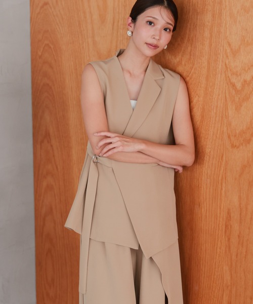結婚式・セレモニー・入学式・卒業式まで幅広く対応するパンツドレスセットアップ。ジレ風デザインが縦ラインを強調し、自然に体型カバーしながら上品な印象に。フォーマルから学校行事まで、きちんと感と着回し力を両立した一着です■ Design ■モダンな印象と上品なシルエットが魅力の、ノースリーブジレセットアップ。ジャケットは、直線的なテーラードラインにアシンメトリーのラップデザインを組み合わせることで、スタイリッシュさと柔らかさを両立。ウエスト部分にはベルトディテールを施し、結ぶ位置によってシルエットの調整が可能です。体型を選ばず、すっきりとしたラインをつくり出すのが特徴です。パンツは、こだわりのラップ仕様と落ち感のあるワイドシルエットがポイント。ゆったりとしたラインながら広がりすぎず、動いたときに生まれるドレープが大人の余裕を感じさせます。フロントのデザインが視線を縦へ誘導し、自然なスタイルアップを叶えてくれるのも嬉しいポイント。ウエスト後ろにはゴムを採用し、快適なフィット感と長時間の着用でも疲れにくいストレスフリーな着心地を実現しました。■ Styling ■セットで着ることでミニマルながら奥行きのあるコーディネートが完成し、オフィスシーンはもちろん、きちんと見せたい日にも最適。ジレはインナーを変えるだけで季節を問わず着回しやすく、パンツもシンプルなトップスとの相性が良いため、単品でも幅広く活躍します。“スタイリッシュさ”“女性らしいライン”“動きやすさ”のすべてを兼ね備えた、オンでもオフでも頼れる大人のセットアップです。※インナーはスタッフ私物■ おすすめのシーン ■同窓会・謝恩会・演奏会・式典・お食事会・お宮参り発表会・両家顔合わせ・入学式・卒業式・入園式・卒園式・授業参観など様々なフォーマルシーン、セレモニーシーンにお勧めです。【注意事項】※商品を使用前に、タグ等に記載されている「取り扱い上の注意書き」、「洗濯表示」を必ずご確認ください。※商品写真はできる限り実物の色に近づけるよう徹底しておりますが、撮影環境、お使いのモニター設定やお部屋の照明等により実際の商品と色味が異なる場合がございます。あらかじめご了承ください。 アイテムサイズMジャケット身丈(前/後):73/68cmバスト:96cmウエスト:82cm肩幅:37cmパンツ脇丈:96+4cmウエスト:68cmヒップ:120cm股下:66cm渡り:41cm裾巾:40cmLジャケット身丈(前/後):75/68cmバスト:100cmウエスト:86cm肩幅:38cmパンツ脇丈:98+4cmウエスト:72cmヒップ:124cm股下:70cm渡り:41.5cm裾巾:41cmモデル162cmMサイズ着用-----------------------------haremodeは、オケージョンやフォーマル、セレモニーシーン、パーティーシーンに適したオケージョンスーツ、フォーマルスーツ、セレモニースーツを取り扱っております。スーツだけでなく、ドレスやアクセサリー、パンプス、バッグ、も取り扱っておりますので是非ご利用ください。------------------------------
