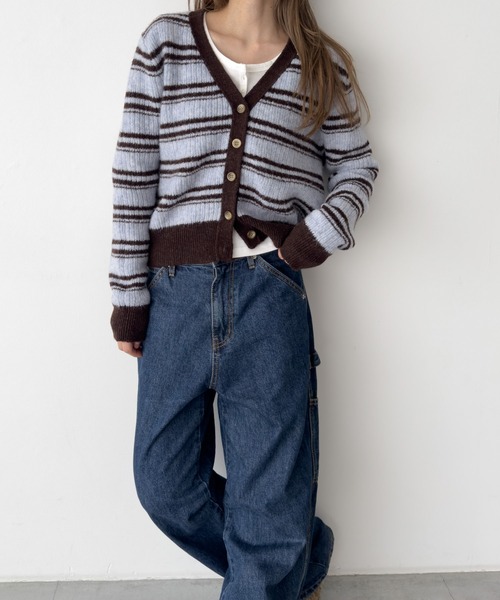 デザイン コーディネートの主役になるボーダー柄のニットカーディガン。 短めの丈感でこなれ感をプラスしてくれます。 素材 軽い着心地でストレスなく着ていただけます。 コーディネート ボタンを開けて羽織りとしてはもちろん、ボタンを閉めて1枚着としても◎ デニムやワイドパンツと合わせたカジュアルスタイルや、綺麗めパンツとも合わせていただけます。 ------------------------------------- 生地の厚さ:厚い〇〇●〇〇薄い 伸縮性:あり 透け感:なし 裏地:なし 光沢:なし ------------------------------------- 【ニットのお手入れ方法について】 ニットの風合いを損なわず、きれいに保ち続けるためには日頃のケアが必要です。 1日着用して湿気がこもったニットは、風通し良い場所に干し湿気を取り2-3日お休みさせてください。 型崩れさせないようにするために畳んで保管するのがおすすめです。 ハンガーで保管の場合は、肩線が崩れないように厚みのあるハンガーや木製ハンガーをご使用ください。 【毛玉のケア方法】 毛玉取り器を使い、優しく回しながら取り除いてください。 毛玉が大きいものや毛足の長いものは、毛玉をつまみハサミでカットするのがおすすめです。 取扱い ・蛍光増白剤が入っていない洗剤をご使用ください。 ・クリーニングネットをご使用ください。 ・濃い色と白 ・淡色物は分けて洗ってください。 ・洗濯で多少縮むことがあります。洗濯後はすばやく形を整えて干してください。タンブラー乾燥はお避けください。 ・アイロンの際は当て布をご使用ください。 ・着用時の汗や摩擦により、他の衣類や鞄などに色移りすることがありますので、淡色系との着合わせはご注意ください。 ・摩擦や引っかけにご留意ください。 ※取り扱い及びお手入れ方法については、商品についている取扱表示、洗濯表示にてご確認下さい。 ※照明の関係により、実際よりも色味が違って見える場合があります。またパソコン・スマートフォンなどの環境により、若干製品と画像のカラーが異なる場合もございます。 ※商品の色味は、商品アップ画像をご参照ください。