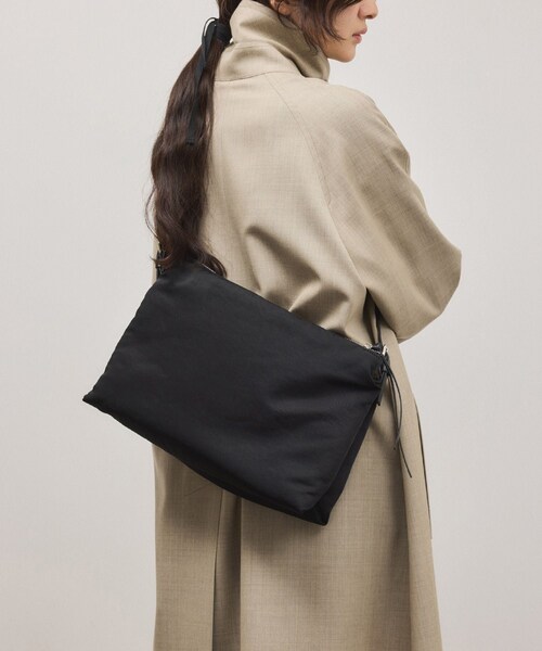 ◇26SS◇ ADAM ET ROPE' FEMME 【Material】 表地:ほどよくシャリ感のあるナイロン素材を使用。軽やかな風合いが魅力。 裏地:ペットボトルを再利用した、リサイクルポリエステルを使用。 【Design】 ふかっとしたボリューム感が目を引く、存在感たっぷりのパデットショルダーバッグ。 カジュアルな素材をベースにしながらも、華奢なハンドルや上質なフェイクレザーを組み合わせることで、ラフになりすぎない大人カジュアルなデザインに。 程よい柔らかさと軽さがあり、デイリーで気兼ねなく使えるのも魅力。 内装は仕切りになっており、スマホや小物をきちんと整理しやすい仕様。 見た目以上の収納力があり、普段のお出かけはもちろん、休日や旅行シーンにもおすすめ。 ショルダーは長さ調節が可能。 肩掛け・斜め掛け・手持ちと、コーディネートや用途に合わせて幅広い使い方が楽しめるアイテム。 把手強度…製品検査有り、JIS規格基準で合格結果(基準判定用の参考数値 4〜5L) 【Color】 軽い印象の浅めブラックと落ち着いたニュアンスが魅力のカーキの2色展開。 ---------------------------- ポケット:あり(内2個) 収納:長財布→可 付属ショルダー:長さ調節可能 ----------------------------- ※撮影時の光、お使いのモニター環境によって色の見え方が違う場合がございます。