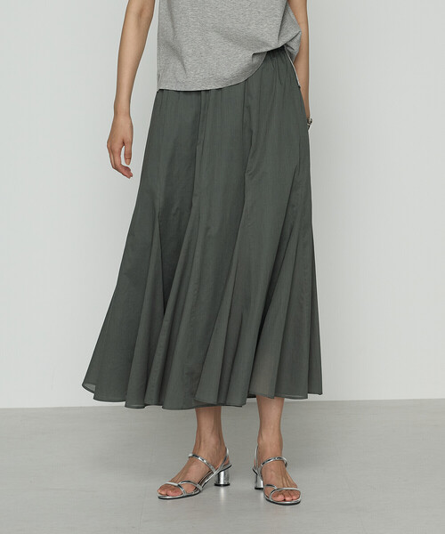 《デザイン》裾に向かって広がりのあるシルエットが美しいギャザーフレアスカートです。存在感のあるシルエットがシンプルになりがちな春夏のスタイリング主役になれる一着です。透け感のあるコットンローンなのでとても軽くて涼しい、夏にぴったりのふんわりエアリーなスカートです。ウエストゴムなので締め付け感もなく、快適な着心地です。7月度のツインニット(商品番号:34-50IM01-205)との相性がぴったりなので、合わせてお楽しみください。《素材》細い糸をたてよこに使用したコットンローンにタンブラーワッシャーを施した表情のある素材です。軽量で通気性があり肌離れの良い素材ですので、暑い夏を快適に着られます。お手入れ方法:手洗い可能