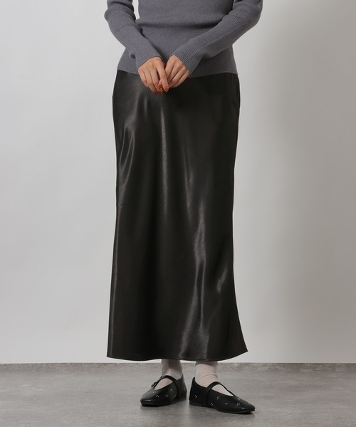 光沢感のあるサテン素材のスカート。裾に向かって広がるのあるデザインで動きのあるシルエットが特徴の1枚です。ウエスト後ろにゴムを使用し着脱しやすさもポイント。【素材】華やかな光沢感とソフトな風合いのヴィンテージサテン生地。【スタイリング】上品な雰囲気のアイテムなので合わせるだけで女性らしいスタイリングが完成します。オーバートップスとの相性も〇