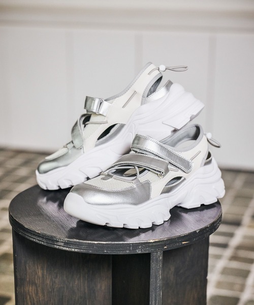 ボリュームのあるソールにクロスコードを組み合わせた厚底スニーカー。 靴下とのコーディネートもお楽しみいただけ、ロングシーズン活躍するアイテムです。 足元にポイントを置いてくれるので、スタイリング全体がバランスよく見え、スタイルアップ効果も。 カジュアルさと可愛らしさをプラスでき、デイリーにお使いいただけます。 甲部分は面ファスナーでホールドでき、かかとのドローコードでフィット感の調整が可能です。