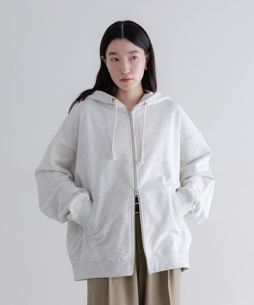 ■素材ほど良い肉感で肌触りの良い裏毛素材。 ■デザインほど良いオーバーシルエットのジップフーディー。大きめのフードがポイントで、ダブルジップ仕様なのでジップの開け方を変えることで様々なスタイリングを楽しめます。ロープ状のスピンドルでマリンテイストにすることで春らしい仕上がりとなっています。