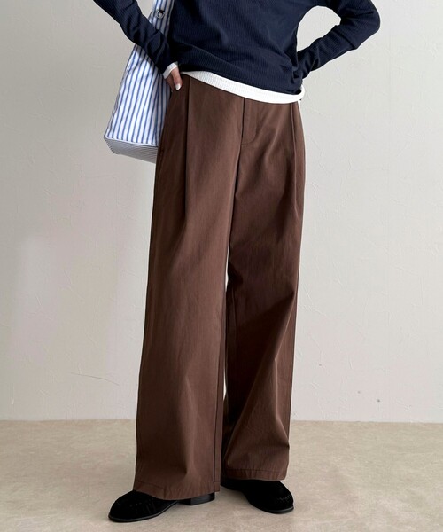 "◇fredy emue◇【2026 SS】小柄な方にも嬉しい34サイズ登場!ディテールで差がつく大人のチノタックパンツ●point・タックを効かせたデザインで脚長効果を叶えるチノタックパンツ・今年はトレンド感のあるブラウンカラーを取り入れ、スタイリングに旬のムードをプラス・後ろポケットのFR刺繍やDカン使いなど、細部までこだわったデザインがポイント・程よくハリ感のある素材はカジュアルからきれいめまで、幅広いテイストにマッチ・シンプルながらもさりげないアクセントがあり、デイリーからきれいめカジュアルまで幅広く活躍する一着です●STAFF着用コメント153cmスタッフ(34サイズ着用):34サイズは丈感がちょうどよく、小柄でもバランスよく履けました!タック入りで腰回りはすっきり見え、きれいめにも使いやすいです◎程よいハリ感があり、デイリーからお出かけまで幅広く活躍しそうです!透け感:なし裏地:なし伸縮性:ウエスト後ろゴム入り光沢感:なし洗濯:手洗い可◇商品のお気に入り登録◇気になる商品は、お気に入り登録がオススメです!クーポン情報、入荷情報が、通知されるようになります。※お手入れの際は、商品についている品質表示タグの取扱い表示をご確認ください。●お取扱い上のご注意●*商品を長くご愛用していただきたいため、アテンションタグがある場合は必ずご確認の上、着用又はお取り扱い下さい。*画像の商品はサンプルとなりますので実際の商品と仕様(主にファスナー・釦等の付属品)、加工、サイズが若干異なる場合がございます。*店頭及び屋外での撮影画像は、光の当たり具合で色味が違って見える場合があります。商品の色味は、スタジオ撮影の画像をご参照下さい。*商品画像に関しては出来る限り忠実に表示出来るよう努めておりますが、お客様がご利用のモニターの設定及び特性により、実際の商品と比較し色味に若干の誤差が生じる場合があります。*製品洗い加工の商品は、多少の歪み、シワなどが見られたり、風合いやサイズ等が1枚1枚異なります。汗や雨等で濡れた時や、摩擦により色落ちし、他の衣料を汚すことがありますので(特に濃色のもの)ご注意ください。※サンプルでの採寸のため、サイズ表はあくまで目安となります。予めご了承ください。"