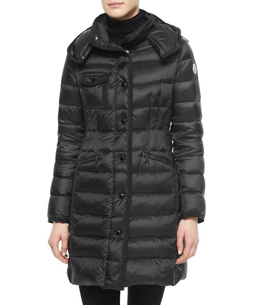Moncler "Hermine" puffer coat.High collar with hood; snap front.Long sleeves.Right chest flap pocket.Angled front zip pockets.Nylon; 90/10 down/feather fill.Made in Romania.Model's measurements: Height 5'11"/180cm, bust 32"/81cm, waist 24"/61cm, hips 34"/86cm, dress size US 2/4.