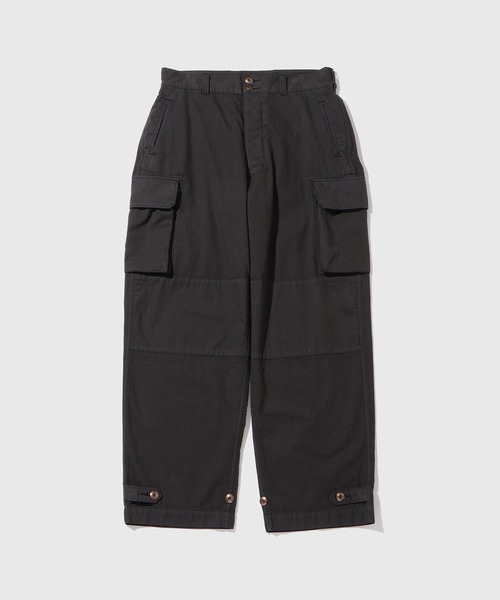 【素材】・粗野な雰囲気のミリタリー然としたコットン素材にヴィンテージ加工を施して、穿きこんだ風合いに仕上げています・生地は高密度で織り込んだコットンオックスで、ハリとコシがあってヘビーデューティーです ・製品ボールバイオ加工しているので、購入してすぐにワードローブやコーディネートに馴染みます 【デザイン】・迫力あるワイドシルエットのユーロミリタリーテイスト6ポケットカーゴパンツ・ 軍パン特有のハードはなく、程よいユーズド感がリラックスした雰囲気で着こなせます ・ フランス軍M47をリファレンスにして、本格的なデティールはそのままにウエストサイドにタックを入れて少しバルーンっぽいシルエットに仕立ててます