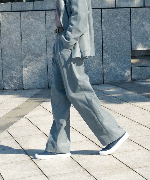 【素材】・高密度のキュプラに太番手のコットンを打ち込んだ 柔らかく滑らかなタッチと上品な光沢が魅力の素材・フィブリル加工によりピーチタッチでヴィンテージライクな表情出しつつ、肌面にはコットンが回ってきており、快適な着用を実現しています・キュプラは綿から生まれた再生繊維で、柔らかく滑らかなタッチと上品な光沢が魅力で高級感があり、そこにコットンならではのナチュラルさが加わることで、きれいめにもカジュアルにも使える万能な表情に仕上がっています【デザイン】・2プリーツのインタックが生む、美しい立体シルエット・高めのウエスト位置で履く設計、脚長効果とクラシックな雰囲気を提案・バックルループ付きでベルトの位置がズレず、シルエットをキープ・タックインスタイルも綺麗にきまる設計