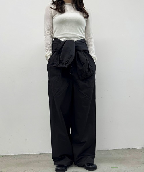 ■ Point. ウエストデザインが目を引く、存在感のあるワイドパンツ。腰巻のようなディテールが、シンプルながらもスタイリングのアクセントに。トップスをインするだけで、自然とこなれた印象に仕上がります。 腰巻デザインの部分はボタンで取り外し可能。 シンプルなパンツとしても着まわしていただけます◎ シルエットは程よくルーズで体のラインを拾いにくく、リラックスした履き心地も魅力。ハリのある素材感で、高見えとルーズ感を両立。 シンプルなブラックと、春らしいバターイエローに2色展開です。 ……………………………………………………… 透け感:なし 厚さ:やや厚め 伸縮性:なし(ウエスト部分はゴム+紐) 裏地:なし シワ:ややつきやすい ……………………………………………………… 【ZOZOTOWNでお買い物を上手にお楽しみいただく2つのPOINT】 ▼購入ボタン横の(ハートマーク)をクリック! 完売カラーの再入荷通知や、ラスト1点の通知、セールの通知も受け取ることができます。 (クリックで商品のお気に入り登録) ▼ショップのトップページにある♡(ハートマーク)「お気に入りショップに追加」をクリック! 新商品や再入荷等、いち早くブランドのお得な情報を受け取ることができます。 (ブランドのお気に入り登録) ※他のキャンペーンにより、期間中に価格が変動する場合があります。 ※セールは予告なく終了させていただく場合もあります。 ※モデル着用商品の画像はサンプルのため、実際の製品とは仕様や加工、サイズ等が若干異なる場合がございます。 ※商品の色味は、撮影場所や光のあたり具合・お客様のお使いのPCのモニター環境などにより色味が違って見える場合がございます。予めご了承の上ご注文下さい。 ……………………………………………………… パンツ ズボン ワイドパンツ 2WAY ウエストマーク 腰巻 レイヤードデザイン ツイル ブラック イエロー 黄色 ウエストゴム 夏 冬 春