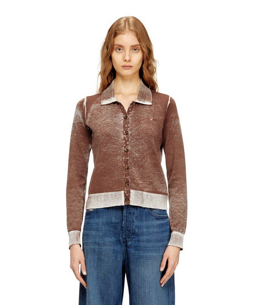 フェードカラーが魅力的な襟付きカーディガン「M-LOREN」。コットン糸を使いプレーン編みで編み上げ、全体にプリントが施された一枚です。羽織りとしてはもちろん、前を閉じてプルオーバー風にしても様になるすっきりとしたシルエットも◎。胸元にはDIESELのマイクロロゴ刺繍を配し、クールなアクセントにしています。