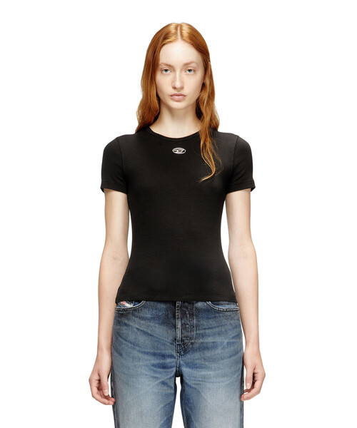 スリムフィットの半袖トップ「T-ELE-LONG-OD」。正面にオーバルDのロゴをあしらい、ワンポイントにしました。抜群のストレッチ&しっとりとしたコットンリブ仕立てで、着心地も良好。すっきりと細身の分、羽織ったときにもたつきにくく、インナーとして着まわしやすい一枚です。