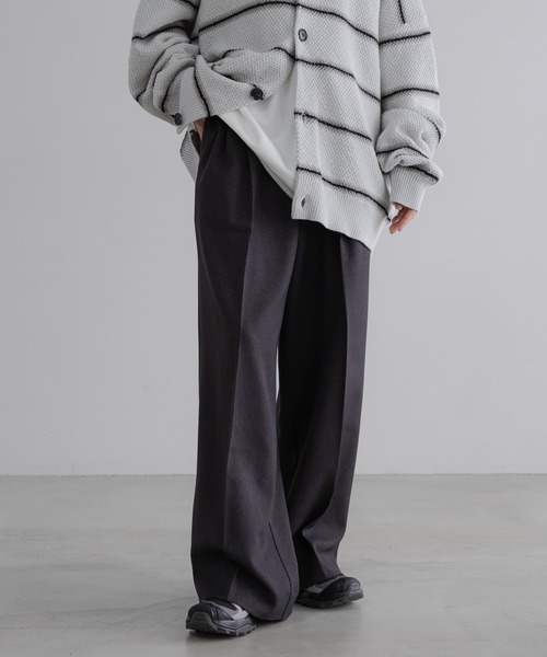 ■素材まるでウールのような膨らみのある風合いが特徴的なウールライクファブリックを使用。シワや毛玉になりにくくお手入れも簡単な素材なので普段使いしやすくなっています。■デザインフロントに2タックが入ったバギーシルエットのトラウザーです。後ウエストベルトはイージー仕様にしているため、幅広い体型の方にお楽しみいただけます。ボリュームのあるシルエットなので、シンプルなスタイリングにも程よいアクセントになります。また、カジュアルなフーディやスウェットなどと合わせていただくのもお勧めな一着です。