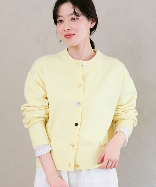 軽くてふんわり。肌さわりがよく柔らかい質感が魅力のヤクライクカーディガン。●ポイントトラッドなメタルボタンとクラシックなビジューボタンをアソートで配置し、遊び心のあるキャッチーなデザインに仕上げました。トレンド感のあるショート丈シルエットは、どんなボトムともバランス良く合わせていただけます。手コートにインしてもかさばらず、スタイリングのポイントとして活躍する華やぎカーディガンです。華やかなビジューボタンをデイリーに取り入れやすい、春を意識した抜け感のあるカラー展開も魅力です。※取り扱いについては、商品についている洗濯表示にてご確認下さい。※照明の関係により、実際よりも色味が違って見える場合がありますまたパソコン・スマートフォンなどの環境により、若干製品と画像のカラーが異なる場合もございます。※商品の色味は、商品アップ画像をご参照ください。【注意事項】・画像の商品はサンプルです。・サイズ表記はあくまで目安となります。実際の商品と仕様、加工が若干異なる場合があります。
