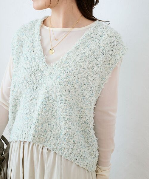 単色では出せない奥行きのある編み地で、シンプルなコーデでも一気に華やかに。ミックスカラーの表情感がポイントのVネックベスト。●ポイント顔周りをすっきりと見せてくれるVネックデザインで、レイヤードしやすくリラックスした着心地。カットソーやシャツ、ブラウス、ドレスなどコーディネートの幅を広げてくれます。リボンチュール×カスリスラブの組み合わせで、見た目より軽く、長いシーズン着用可能です。デザイン性がありながら、手洗い可能でデイリーに使いやすいのは嬉しいポイントです。いつものコーディネートにプラスするだけでシャレ感のあるスタイリングが完成します。※取り扱いについては、商品についている洗濯表示にてご確認下さい。※照明の関係により、実際よりも色味が違って見える場合がありますまたパソコン・スマートフォンなどの環境により、若干製品と画像のカラーが異なる場合もございます。※商品の色味は、商品アップ画像をご参照ください。【注意事項】・画像の商品はサンプルです。・サイズ表記はあくまで目安となります。実際の商品と仕様、加工が若干異なる場合があります。