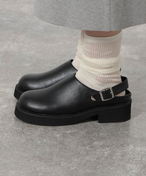 丸みのあるころんとしたシルエットがかわいらしいサボ。ストラップを前後に動かすことができ、2WAYでお使いいただけます。ベルトを後ろにすると、ホールド感があり歩きやすさも◎前にするとミュールタイプになり、着脱のしやすさや雰囲気の変化をお楽しみいただけます。ヒールは程よい高さで、スタイルアップと歩きやすさを両立したデザインに。素足で履くのはもちろん、靴下とのスタイリングをお楽しみいただけ、長いシーズン活躍するアイテムです。