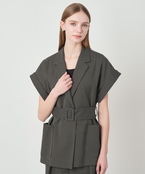 【Spring & Summer Collection 2026】 イタリアインポートのストレッチジャガード素材。 コットン高混率のナイロンによるソフトなタッチが特長で、細番手の糸を使用することで軽量化も実現。 また、高いストレッチ性によりストレスフリーな着心地も期待できる素材です。 ハーフスリーブのベルテッドジャケット。 ジレよりも腕をカバーしてくれ、合わせるカットソーやデコルテの開いたインナーとも相性抜群。程よいリラックス感もありながら、衿付きなのでカジュアルになりすぎない印象です。 シリーズのパンツ(品番10261112320)とセットアップで着用すれば、ANAYIらしいキレイ目なお出かけ、通勤にお勧めしたいルックを叶えます。 【付属】なし 【裏地】なし 【透け感】なし 【開き・留め仕様】留め無しで、サッシュリボンベルトのみ 【伸縮性】なし 【ケア方法】クリーニング 【着用感・生地の厚さ】薄地の柔らかいピンドットジャガード アイボリー着用 model:175cm 着用サイズ:38 ブラック着用 model:174cm 着用サイズ:38 【ANAYIサイズ表】 34サイズ:5号 XSサイズ相当 36サイズ:7号 Sサイズ相当 38サイズ:9号 Mサイズ相当 ・「商品のお気に入り登録」や「ブランドのお気に入り登録」で新商品や再入荷通知、セール通知などのお得な情報を受け取ることができます。 ・照明の関係により、実際よりも色味が違って見える場合がございます。 またパソコン・スマートフォンなどの環境により、製品と画像のカラーが異なる場合もございます。予めご了承ください。