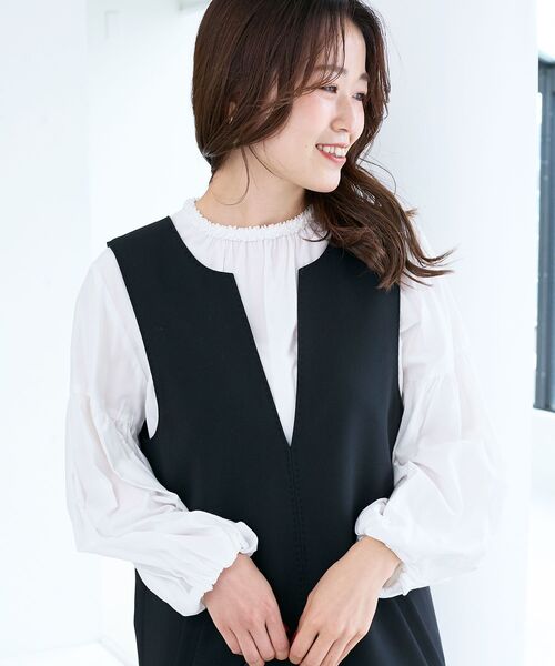 タックを施したボリュームスリーブが印象的な、シャツ地ブラウスです。●ポイントシンプルな身頃に対し、大胆で構築的な袖バランスが際立ち、着るだけでスタイリングが決まる主役級の一枚です。衿元に細いグログランテープをいくつも折り重ねてスパンコールをあしらい、さりげない華やかさをプラス。透明なスパンコールなのでキラキラしすぎず、セレモニーに使いやすいデザインになっています。袖口はゴムが通してあるため、捲ると袖のシルエットを調整できます。生地はレーヨン混でしっとりなめらかなタッチで、柔らかい肌触り、またポリエステル混なのでシワになりにくく、型崩れしにくいため、お手入れしやすくなっています。※取り扱いについては、商品についている洗濯表示にてご確認下さい。※照明の関係により、実際よりも色味が違って見える場合がありますまたパソコン・スマートフォンなどの環境により、若干製品と画像のカラーが異なる場合もございます。※商品の色味は、商品アップ画像をご参照ください。【注意事項】・画像の商品はサンプルです。・サイズ表記はあくまで目安となります。実際の商品と仕様、加工が若干異なる場合があります。