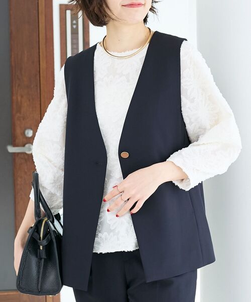 さりげないバックフリルがアクセントになった、華やかさと着回し力を兼ね備えたジレ。 フロントはすっきりとしたシンプルデザインで、きちんと感がありながらも、気軽に羽織れる一枚です。 ●ポイント 二重織り(ダブルクロス)構造のため、程よい厚みとハリ感のあるツインクロス生地という上品さと実用性を兼ね備えた素材を使用。 体のラインを拾いにくいのが特徴で長時間着用してもシワが出にくいのが特徴です。 フロントは釦1個で着脱しやすく、ゴールドがワンポイントになっています。 両サイドポケット付きで実用性も◎ ●おすすめコーデ ブラウス×パンツに羽織って、シックな大人きれいめスタイルや、カットソー×デニムで、程よくカジュアルなデイリースタイルにも。 ワイドパンツ・細身パンツどちらとも相性が良く、着こなしの幅が広がります。 同素材の3062055901 ツインクロスタックテーパードパンツと合わせたセットアップスタイルで、通勤・オケージョン・セレモニー・マザーニーズまで幅広く活躍します。 ※取り扱いについては、商品についている洗濯表示にてご確認下さい。 ※照明の関係により、実際よりも色味が違って見える場合があります またパソコン・スマートフォンなどの環境により、若干製品と画像のカラーが異なる場合もございます。 ※商品の色味は、商品アップ画像をご参照ください。 【注意事項】 ・画像の商品はサンプルです。 ・サイズ表記はあくまで目安となります。 実際の商品と仕様、加工が若干異なる場合があります。