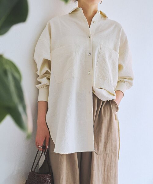 ■アイテムシルクネップ生地を使用した、表情豊かな素材感が魅力のオーバーサイズシャツ。本体はシルクをメインに、ネップ(節)によるぽつぽつとした凹凸がヴィンテージライクな雰囲気を演出します。背中のヨーク部分は二重仕立てにし、フリンジをあしらうことで、後ろ姿にもさりげないアクセントをプラス。腰まわりが隠れる着丈に、裾はラウンドカット+深めのサイドスリット入りで、軽やかな抜け感のあるシルエットに仕上げています。一枚で存在感がありながら、シルクならではの上品さも兼ね備えた、ビアズリーらしいこだわりのシャツです。■素材・洗濯表示素材本体:シルク82%ナイロン18%フリンジ部分:綿100%洗濯表示:手洗い可※着用時・洗濯時は、必ず取扱い表示・タグをご確認の上、お取り扱い下さい。----------------------------------伸縮性:なし光沢:なし厚み:ふつう透け感:なし(アイボリーはややあり)裏地:なし(背中ヨーク部分は二重)ポケット:あり(両胸)ファスナー:なし(ボタン仕様)----------------------------------《お取り扱い上のご注意》・濃色物と白色・淡色物はわけて裏返してネット使用、洗濯の際は軽く押し洗いをしてください。・長時間水に漬けておいたり、濡れたまま放置しないでください。・タンブル乾燥不可・この製品には、フリンジ(飾り)を使用しています。着用やクリーニングを繰り返すことにより、フリンジが乱れることがあります。・この製品材は水分や汗、摩擦(特に湿った状態での摩擦)などにより、色落ちや色移りすることがありますので、着用時・クリーニングの際は充分ご注意下さい。・洗濯の際、他のものと一緒に洗わないで下さい。濡れた状態で他の洗濯ものと一緒に重ね合わせないで下さい。漂白剤及び漂白剤入り洗剤使用不可。《予約商品について》・サンプルの為、素材情報、洗濯表示については企画段階の情報を記載しております。公的機関での試験データ結果を受け、量産にあたり混率や洗濯方法の変更が発生する場合がございますので、ご了承くださいませ。・サンプルでの撮影、計測をしております。商品の仕様が一部変更になる場合がございます。・撮影サンプル品はブランドタグがついておりません。製品にはタグがつきますので、製品の表に縫い糸が見える場合がございます。・工場の生産の都合上、納期が変更になる場合がございます。検品や輸送の関係で、発送日が前後しますのでご了承ください。また、入荷状況により、お客様への発送が店頭販売より遅れる場合もございます。・店頭に陳列していた商品も含まれる場合がございます。《商品画像について》ご覧頂いている商品の写真につきましては、できるだけ実物の色に近くなるように努めておりますが お使いの環境(モニター、ブラウザ等)の違いにより、色の見え方が実物と若干異なる場合がございます。 予めご了承ください。《ハートをタップして商品のお気に入り登録》【ハートをタップ】登録カラーの商品の「残りわずか」「再入荷」「値下げ」通知を受け取ることができます。【各ショップアプリにてブランドフォロー】 新商品などの入荷情報、最新のニュースやお得な情報を受け取ることができます。