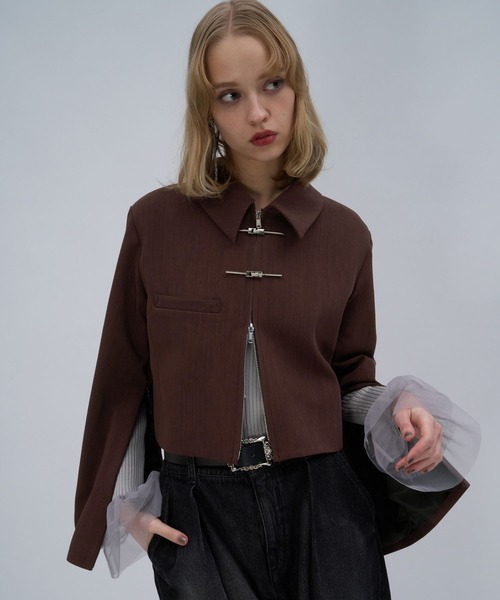 ーーーメタルのチャイナパーツが特徴的なショート丈ジャケットーーーpoint□直線的なラインにメタルのチャイナパーツがシャープな雰囲気で存在感抜群□金具以外はシンプルなデザインで作成し、様々なシーンで着用可能□袖下ジップ付きで気温調節がしやすいデザイン□バランスが取りやすいショート着丈styling骨格ナチュラル:ハイネックのインナーを合わせて首元から見せるスタイルが〇インナーの柄や色でなりたいイメージを変えられます。ボトムスはナローやAラインのものがオススメ。骨格ウェーブ:動きのあるスカートやワンピースに合わせるとモードながら綺麗めな印象にまとまります。レースやチュールなど柔らかい素材を合わせるとより女性らしいスタイルになります。骨格ストレート:ストレートでワイドすぎないシルエットのボトムスと相性◎足元はヒールで合わせるとシャープな印象になりオススメです。set item同デザインのスカートとセットアップで着用可能。セットアップ対応アイテムはコチラを検索→【638793】※加工を施した画像を使用しております。実物と色味が異なる可能性があるため、色味は詳細後ろにある生地寄り画像を参考にお願いいたします。あらかじめご了承下さい。