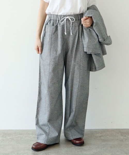 凹凸のある、天然素材ならではのネップ糸で織り上げたナチュラルな風合いのパンツ。 絶妙な大きさの格子柄で程よい甘さのギンガムチェック(ブルー)とスタイリングに馴染む千鳥チェック(その他)、清涼感がありながらも落ち着いたネイビーのオリジナルテキスタイルを作りました。適度にハリがあり、肌離れするドライタッチな生地がこれからの季節にぴったりです。 ウエストは一周ゴム仕様で、快適な履き心地が嬉しい。トップスの裾を入れてもすっきりとしたシルエットです。ワークな印象の切り替えポケットとセンターラインに接ぎを作り、立体感のある仕上がりに。裾をロールアップしてもこなれた雰囲気に。存在感のある一着で着映えするので、シンプルな無地カットソーと合わせてもさまになります。同素材のジャケット(5001JK004261)とのセットアップスタイルもおすすめ。ワンピース(5001OP002261)もご用意しております。 -------------------- 透け感:なし 裏地:なし 伸縮性:なし 光沢感:なし ポケット:あり -------------------- 【素材の特性・お取り扱いの注意】 ・取り扱いの注意については取り扱い表示をよくご確認の上、着用をお願い致します。 ・ネップやスラブなどの糸ムラが特徴の生地を使用しています。天然素材ならではの風合いをお楽しみ下さい。 ・汗や雨等で濡れた場合、摩擦などにより色落ちし、他の衣料に移染することがありますのでご注意下さい。 ・直接、日光や蛍光灯に長時間当てると変色する可能性がありますので、保管時はご注意下さい。また、色褪せ変色は経年変化によるものですのでご了承下さい。 ※撮影画像は、光の当たり具合やモニターの環境により色味が違って見える場合があります。あらかじめご了承下さい。 ※一番最後にある前横後ろの詳細画像が実際の色味に近い写りです。 ※ブルーの画像はサンプルを着用しています。お届けする実際の商品と仕様、加工、サイズが若干異なる場合があります。 サンプルの画像からパンツ丈が1.5cm詰まります。後ろポケット口とボタンが左右でそれぞれ1.5cmずつ中心に寄り、バランスが良くなります。