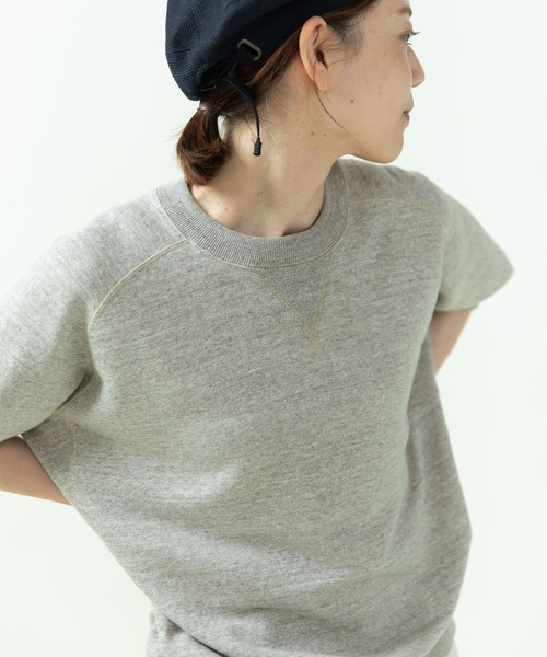 ヴィンテージライクな裏毛の半袖カットソー。気温の高い日にも快適に着やすい、薄手で軽さのあるミニ裏毛素材を使用。アイボリー、ピンク、ブルーには製品染めを施し、スタイリングに馴染むニュアンスカラーに仕上げました。やわらかな風合いで、着古したようなこなれ感のある1枚です。メンズライクな中にも、ややきゅっとした袖口でかわいらしさを残しました。首元のガゼット仕様や衿、袖、裾に施した微配色のリブ使いなど、シンプルながらもこだわりを詰め込んだ着こなしの主役になる一枚。めずらしい脇下の三角マチはどこか遊び心を感じるディテールです。着映えする裏毛カットソーは、デニムやチノパンツなどのベーシックな定番ボトムと合わせてもさまになります。さらっとしたイージーパンツやレースのスカートなど、落ち感のある夏型のアイテムとも相性抜群です。※アイボリー、ピンク、ブルーは後日販売開始致します。--------------------透け感:なし裏地:なし伸縮性:ややあり光沢感:なしポケット:なし--------------------【素材の特性・お取り扱いの注意】・取り扱いの注意については取り扱い表示をよくご確認の上、着用をお願い致します。(アイボリー、ピンク、ブルー)・独特の風合いを出す為に製品染めを施しております。一枚ごとに風合いや色の出方、サイズなど微妙に異なります。また、お洗濯を繰り返す事により色落ち、変化していきます。他の商品では味わえない雰囲気をお楽しみ下さい。・汗や雨などで濡れた場合、摩擦により色落ちし、他の衣料に移染することがありますので白または薄い色とのコーディネートは極力お避け下さい。・お洗濯の際に、他の衣料に移染する可能性がありますので単独洗いをして下さい。濡れたまま放置せず、速やかに脱水・乾燥して下さい。・直射日光や蛍光灯に弱く、変色の恐れがありますので陰干しして下さい。・ポリウレタンが含まれております。熱により縮む性質がありますので、高温のアイロンやタンブラー乾燥はお避け下さい。※撮影画像は、光の当たり具合やモニターの環境により色味が違って見える場合があります。あらかじめご了承下さい。※画像はサンプルを着用しています。お届けする実際の商品と仕様、加工、サイズが若干異なる場合があります。グレーのサンプルの画像から総丈が4cm詰まります。裄丈が左右でそれぞれ3.5cmずつ詰まり、袖が短くなります。