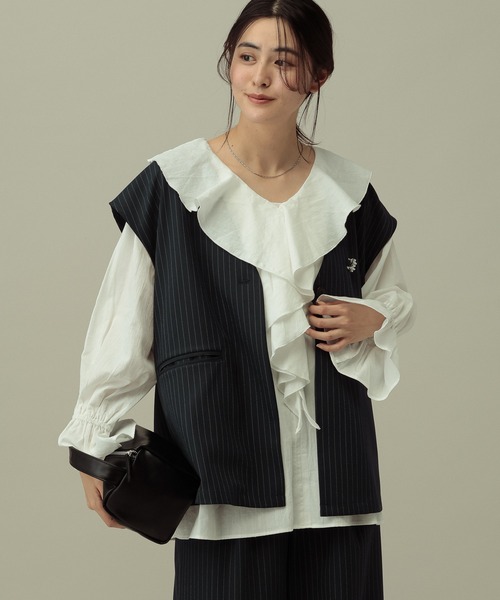 【セレモニー/卒入式にもおすすめ♪】羽織るだけでスタイリングを格上げしてくれるジレ。身幅にゆとりがあり着丈も長めなので気になる部分をカバーしてくれるのもポイント。広めの肩幅はこなれ感もあり、胸元がすっきりとしているのでほどよい抜け感もプラスできるアイテムです。【素材】上品できれい目な印象のパウダリーツイル素材。落ち感のある素材でしわになりにくいのもポイント。[マシンウォッシャブル]ご家庭の洗濯機でお洗いいただけます[イージーケア]シワが発生しにくい素材を使用しています[クイックドライ]乾きが速い素材を使用しています[UVケア]生地を透過する紫外線を遮蔽する機能があります【スタイリング】セレモニーなどのオケージョンシーンにはもちろん、オフィスにも〇オンオフで活躍します。同素材シリーズでのセットアップ着用もおすすめです。▼同素材のシリーズはこちらパンツブランド品番:638594ZOZO商品コード:102579134ジャケットブランド品番:638604ZOZO商品コード:102582110サロペットブランド品番:638586ZOZO商品コード:102582332