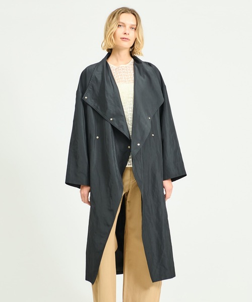 【ESTNATION(エストネーション)】 軽めの羽織りとして活躍するモードな印象のコート。 表面に微光沢があり、膨らみがありつつもドレープ性に優れたタフタ素材を使用。 前端を裾に向かって斜めにカットし、モダンな雰囲気と軽さを意識したダブルブレストデザイン。共布サッシュベルト付きで着こなしに合わせてアレンジも可能です。 ワイドなスタンドカラーに付けたライトゴールドの小さめドットボタンがアクセントに。 贅沢な分量感のテントラインシルエットに、ゆったりとしたドロップショルダーで、インにジャケットやローゲージのニットなども着れるサイズ感です。 【お買い物をよりお楽しみいただくために】 ▽商品のお気に入り登録(ハートマークをクリック) 完売カラーの再入荷通知や、ラスト1点の通知、値下げの通知を受けることができます。 ▽ブランドのお気に入り登録 ESTNATIONのトップページ右上にある「お気に入りショップに追加」を押していただくと、新商品や再入荷など、いち早くブランドのお得な情報を受け取ることができます。