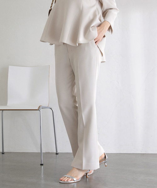 【2026SS】LaTotalite美しいラインにこだわった、すっきり見えが叶うテーパードパンツ。程よい肉感とストレッチ性のある素材を使用し、動きやすさときちんと感を両立しました。脚のラインをまっすぐに見せてくれるセンタープレスが、縦のラインを強調しスタイルアップ効果も◎腰まわりはフィットしすぎず、ヒップから太ももにかけて自然に沿うシルエットで、安心感のある穿き心地です。同素材のブラウスと合わせたセットアップスタイルは、セレモニーやオケージョンシーンにも最適。単品使いでは通勤やきれいめなデイリーコーデにも活躍し、オンオフ問わず着回せる一本です。**********************透け感:なし裏地:ベージュ(027)のみあり伸縮性:あり光沢感:なし生地の厚さ:普通**********************【スタッフ着用コメント】《スタッフ名:mizuki》身長:160cm/体型:普通/普段サイズ:S~M/着用サイズ:36サイズ感:フラットシューズで地面にぎりぎりつかない丈感。素材感:生地はサラッとしており、クリーンで上品な印象。やや伸縮性があります。着心地:ウエスト後ろがゴム仕様で楽な着心地。**********************▼セットアップにもおすすめの同シリーズ26010140230010 2WAYスリットジャケット26051140229010 カーブネックフレアブラウス※素材について【ベージュ(027)】 裏地 ポリエステル100%※お取り扱いについて【グリーンB(032)】日光や蛍光灯の光に弱く、色あせ(変色)しやすい性質があるので、長時間の直射日光は避けてください。※取り扱いについては、商品についている品質表示でご確認ください。※照明の関係により、実際よりも色味が違って見える場合があります。またパソコン・スマートフォンなどの環境により、若干製品と画像のカラーが異なる場合もございます。※商品の色味は、商品アップ画像をご参照ください。本体:洗濯機洗い(弱)