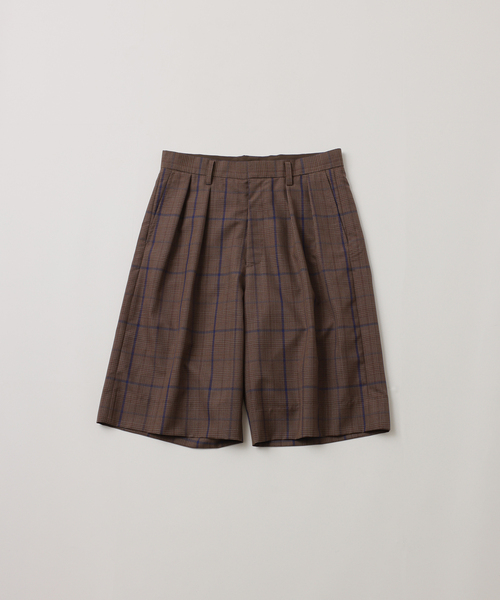 ≪2026SS FOLL Collection≫ baggy fit wardrobe shorts “腰履きの空気感を、通常位置で。” タックショーツの新解釈として、上品さを損なわずに“バギーの抜け感”を纏えるワイドショーツ。 【特徴】 《素材と表情》 ・経糸に60/2双糸ウール、緯糸にウール70/モヘア30の混紡糸を使用し平織で仕上げたオリジナル素材 ・4色の先染め糸を組み合わせて構築したオーバーペンチェック(ブラウンを軸に、ベージュ/カーキ/グレージュ/ブルーを重ねた奥行きある柄構成) ・無地は60番手のウールを3子撚りにしたクリアな表情のウール100% ・それぞれの糸の特性が生む、軽さ・ドライタッチ・ほのかな光沢 《シルエットと構築》 ・2タックを配した裾までゆるやかに広がるワイドレッグ ・裏地をあえて省き、素材の軽さと落ち感をダイレクトに体現 ・通常のウエスト位置で穿くだけで、腰履きを思わせるバギーシルエットが成立 ・スラックスの端正さとストリート的な抜けの中間に立つ、新しいバランス 《着用感》 ・風抜けの良い清涼感と軽い肌当たりで、夏シーズンでも快適 ・身幅の取り方に対して野暮ったさを残さず、シルエットとしての綺麗さを両立 ・Tシャツからシャツ、ジャケットスタイルまで幅広く対応する汎用性 ショーツの軽快さを超えて、ワードローブの“軸”になる一本へ。 素材・運動量・佇まいのすべてを調律し、 夏の装いに新たなシルエットの選択肢をもたらします。 ※カラーによって素材が異なります。 ブラウン(020):毛85%、モヘヤ15% ベージュ(027)、ネイビー(040):毛100% ※取り扱いについては、商品についている品質表示でご確認ください。 ※照明の関係により、実際よりも色味が違って見える場合があります。またパソコン・スマートフォンなどの環境により、若干製品と画像のカラーが異なる場合もございます。 ※商品の色味は、商品アップ画像をご参照ください。