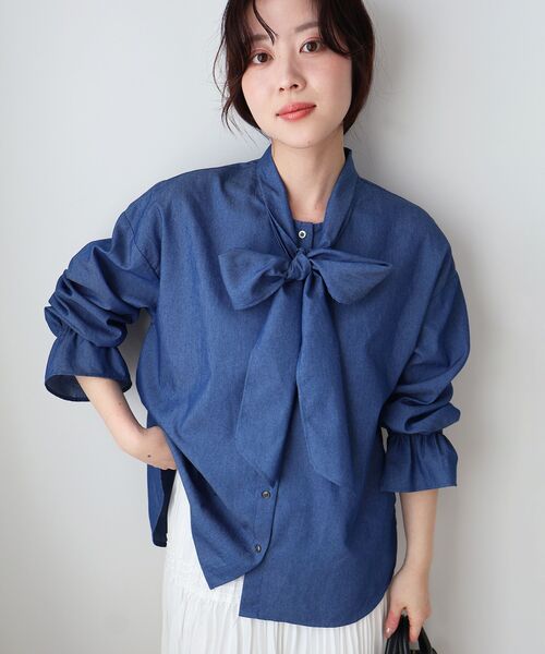 シンプルなデニム素材に華やかなボウタイがアクセント。カジュアルからフォーマルまで幅広く活躍するデニムボウタイブラウスです。上品さとこなれ感を両立させた一枚です。