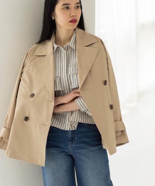 ミドル丈のバランスが今年らしいトレンチコートベーシックに見せながらも、細部のディテールに拘ったデザインもポイント。【デザイン】・どんなシーンにも着回し対応できるミドル丈のトレンチコート。・ヒップラインをすっきりカバーでき、スカートにもパンツにも合わせやすい丈バランスがおすすめです。・ややゆとりのある身幅とラグランスリーブで、着る方の肩周りにもなじみ、すっきりと見せてくれる設計。・背中の風よけヨークには程よくフレアを加え、後ろ姿も着映えるデザインに。・袖口はやや広めに設定し、後ろに切り替えを入れフォルム感を出した細かい拘りのあるスリーブデザイン。ボタン使いで袖口幅の調節も可能です。・バックル付きの共地ベルトをしっかりウエストマークして着こなすと、裾にフレア感も出て上品な着こなしに。・また、ベルトを外し前開きにして着こなすと、抜け感のあるカジュアルな着こなしも可能です。・通勤やセレモニーシーン、カジュアルなデイリーにも着回せるミドル丈のトレンチコートです。【素材】・高密度で適度なハリ感もありながら、肌触りの良いオーガニックコットン混とリサイクルポリエステル混のツイル素材使用。・環境にも配慮したサスティナブルな素材です。・マシンウォッシャブルでご自宅でのお洗濯も可能。【仕様】・ポケット数:横×2・裏地あり・バックル付き共地ベルト付き※照明の関係により、実際よりも色味が違って見える場合があります。また、パソコン・スマートフォンなどの環境により、若干製品と画像のカラーが異なる場合もございます。モデル情報:身長165cm B72 W57 H84 着用サイズ:38(M)店舗へのお問い合わせ商品番号:637-95026●製品寸法:36(S):着丈66cm B109cm 裄丈77cm38(M):着丈67cm B112cm 裄丈78cm40(L):着丈69cm B115cm 裄丈80cm42(LL):着丈69cm B118cm 裄丈81cm備考:重量:約705g(サンプルサイズ)
