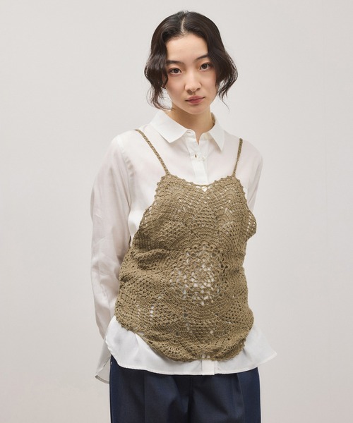 《2WAY・イージーケア》ホルターネックでもキャミソールでも。1枚プラスするだけでパッと華やかさを与えてくれる、シーズンレスに着回せる手編みのレースビスチェ◇26SS◇ADAM ET ROPE' FEMME【Material】ポリエステル100%の糸を使用。繊細な柄が表現できるよう華奢な糸を使用。【Design】手編みで表現したこだわりの柄がポイントのニットビスチェ。フロント側は花柄を何周も重ねた丸いパーツで編み、バック側は花モチーフを並べたような透かし柄に。1枚で映える柄に仕上げたアイテム。ホルターネックでも、後ろの柄に紐を通してキャミソールとしても2WAYで着用が可能。【Color】クリーンな印象で取り入れやすいホワイト、ベージュ寄りのカーキの2色展開。1枚着るだけで新鮮な印象に。【Styling Point】薄手のニットやカットソーにレイヤードして着用していただくのがオススメ。ジャケットやアウターのインナーに着ることでアクセントをプラス。---------------透け感:あり裏地:なし伸縮性:ややあり光沢感:なし生地の厚さ:薄手---------------◇モデル情報身長:164cm size:F(結びヘア)身長:165cm size:F(ジャケットスタイリング)※撮影時の光、お使いのモニター環境によって色の見え方が違う場合がございます。