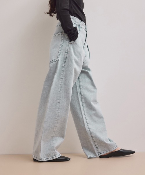 《定番人気・新色追加》スラックスのようなすっきりとしたシルエットが魅力。アジャスト付きでウエスト調節も可能な、履き心地にもこだわったディープライズワイドデニム◇26SS◇ADAM ET ROPE' FEMME【Material】コットンUSA1デニムを使用。製品にてブリーチ加工を施す事で、ハイトーンの色味でありながら立体感のあるムラのある表面に。※強めな加工を施しているため、個体差が生じる場合がございます。【Design】ハイウエストでも穿けるように設定された深めな股上と、バックスタイルの大きなパッチポケットがポイントのワイドデニムパンツ。後ろベルト部分にアジャスターが付いており、お好みのウエスト位置で調整が可能。メンズライクな直線的なシルエットと、フロントに施したタック、フロント斜め切りのポケットなど、スラックスのような雰囲気に。脇線をセンター寄りに縫製する事で、細長シルエットが叶うデニムパンツ。※昨年にご好評いただいた(品番:GAS55520)と同型・同素材アイテムです。【Color】春夏らしい淡いインディゴハイブリーチとブラックハイブリーチでライトグレーに見えるブラック、製品染ライトイエローベージュの3色展開。【Styling point】シンプルなTシャツやタンクトップなどと合わせての着用がおすすめ。デザイントップス合わせも◯。---------------透け感:なし裏地:なし伸縮性:なし光沢感:なし生地の厚さ:やや厚手開き方:フロントファスナー開きポケット:あり---------------◇モデル情報身長:164cm size:F(結びヘア)身長:166cm size:F(ボブヘア)※撮影時の光、お使いのモニター環境によって色の見え方が違う場合がございます。