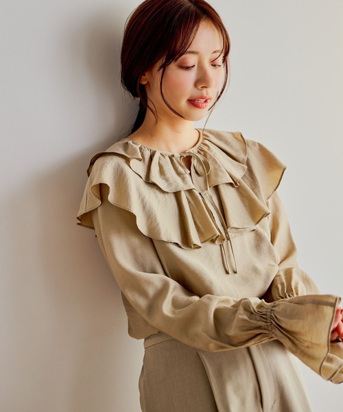 ーーー レイヤードスタイルに最適な長袖フリルブラウス。■point・レーヨン84%、ナイロン16%の上質な素材で、肌触りが良く高級感があります・大きめのフリルが顔周りを華やかに演出し、女性らしい印象に・微シアー感と控えめなシボ感がヴィンテージライクな雰囲気を醸し出し、上品な仕上がり・フレアスリーブデザインで動きがあり、着るだけでフェミニンな印象にーーー■stylingニットやカーディガンのインナーとして着用し、デニムやスカートと合わせてカジュアルダウン。フリルの袖や襟をチラ見せさせると、こなれ感がアップ!キレイ目なパンツやスカートと合わせればオフィスコーデにも◎ジャンスカやナロースカートなどの綺麗めコーデなら、入学卒業などのハレの日にもおすすめです。セレモニー、フォーマル、入卒園、卒業、入学、入園、卒園、ハレの日【INFOMATION】■商品のお気に入り登録完売していても再入荷時に再入荷通知を受け取ることができますので、是非ご登録ください!■ブランドのお気に入り登録新商品や再入荷などの情報を受け取ることができますので、是非ご登録ください!※ご注文いただいた予約商品のお届け時期の確認は、注文履歴ページより行えます。