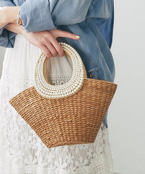 お客様のお声を多数いただき再販売決定!最強モテバッグ!アクセサリー感覚で持てるパールハンドルバッグ●デザイン持つだけでシーズンムードが高まるかごバッグ!天然素材の風合いとデザインポイントになっているパールハンドルが大変愛らしく、まさに最強のモテバッグ♪デートにおすすめです。ショルダーストラップが付属されているので、ハンドバッグとしてだけではなく、ショルダーバッグとしてもお使い頂け、アクセサリー感覚でお使い頂けるのも特長。また、ミニサイズながら必須アイテムはきちんと収納できるサイズ感。バッグの内側は巾着になっているので中身も見えず機能性も抜群です。サイズはこちらのミニサイズとラージサイズの2つをご用意しているので、用途に合わせてお使い頂けます。※ラージサイズはこちらから・パールハンドルバスケットL(LBZ1061612A0001)●ポイント・パールぎっしりのハンドルが上品でおしゃれ・斜め掛けも可能なチェーン付●おすすめのコーディネートシンプルなコーディネートにアクセサリー代わりにプラスするだけで、季節感もおしゃれ度もアップ。デニムスタイルのようなカジュアルなパンツスタイルから、ドット柄スカートなどフェミニンなスカート合わせもおすすめです。●素材本体:天然草木持ち手:プラスチックパール裏地:綿55% ポリエステル45%#cate003