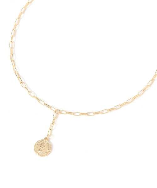 コインモチーフをトップにあしらったネックレス。Y字デザインなので縦ラインを強調でき、すっきりとした印象のスタイリングに仕上がります。