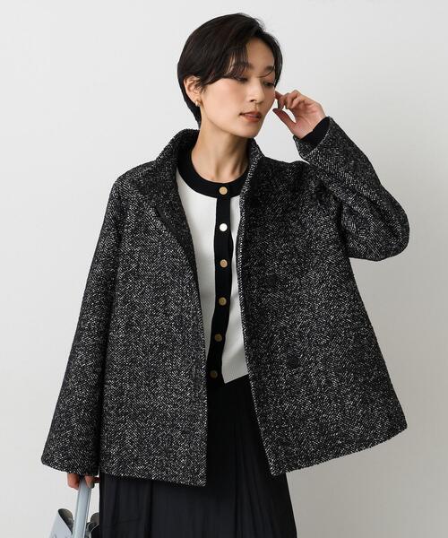 【デザイン】 ファンシーヘリンボンのスタンドカラーコート。 クラシックなデザインがエレガントさを引き立てながら、どんなシーンにもピッタリなアイテムです。 スタンドカラーが首元をすっきりと見せ、シンプルなトップスやニットとも好相性です。 後ろ中心のタックのディテールが可愛らしさを引き立てています。 【素材感】 クラシック感のあるツイード風コート素材。 フラットな糸とスラブ糸やリング糸をミックスして経緯に使用し、ヘリンボーンの組織を作り上げる事で、カジュアル且つ良質な雰囲気に上げた素材になります。 少しバルキーな表情感にヘリンボーン組織が映える今年らしい素材感に仕上げています。 【仕様】 ・ポケット数:横×2 ・裏地あり ※照明の関係により、実際よりも色味が違って見える場合があります。また、パソコン・スマートフォンなどの環境により、若干製品と画像のカラーが異なる場合もございます。 モデル情報:身長163cm B77 W56 H87 着用サイズ:02(M) 店舗へのお問い合わせ商品番号:153-94700 ●製品寸法: 00(XS):着丈57cm B98cm 袖丈55cm 肩幅39cm 01(S):着丈59cm B101cm 袖丈57cm 肩幅40cm 02(M):着丈60cm B105cm 袖丈57cm 肩幅41cm 03(L):着丈61cm B108cm 袖丈58cm 肩幅42cm 備考:重量:約895g(サンプルサイズ)