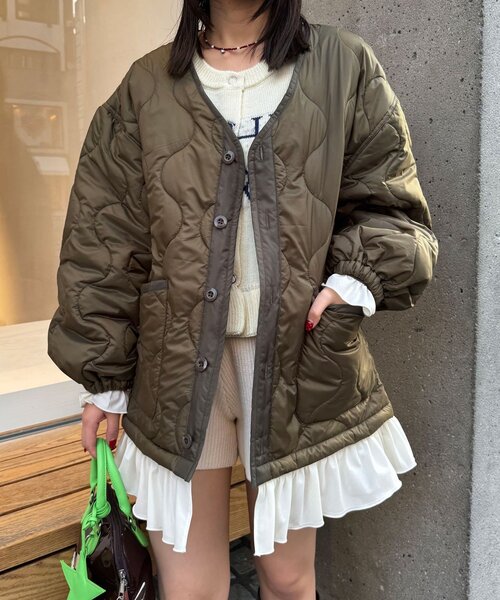 フリルで表情が変わる2WAYジャケット▼ポイントミリタリーライナーをベースに、フリルをレイヤードしたデザインが目を惹くキルティングジャケット。中綿入りで軽さとあたたかさを兼ね備え、デイリーに使いやすい着心地に。裾のフリルは取り外し可能で、甘さを抑えたシンプルな着こなしも楽しめる2WAY仕様です。▼スタイリングフリルを付ければ、ワンピースやショートボトムに合わせてガーリーなミックススタイルに。フリルを外せば、デニムやスウェットパンツと合わせたカジュアルコーデにもマッチします。---------------------------------------------------透け感:なし伸縮性:なし裏地:なし光沢:ややあり---------------------------------------------------家庭洗濯:不可タンブル乾燥:不可アイロン:不可クリーニング:石油系溶剤による弱いドライクリーニング可、ウエットクリーニング不可●製品に使用しております中綿が、着用中に揉まれたり、クリーニング処理により、縫目や生地表面に吹き出ることがあります。吹き出た場合には、無理に引き出さずに、飛び出している反対側からつまみ、中に戻してください。---------------------------------------------------※着用、お取り扱いの際は、商品についている品質表示とアテンションタグを必ずご確認下さい。※画像の商品はサンプルです。実際の商品と仕様、加工、サイズが若干異なる場合がございます。※可能な限り実物に近いカラーにて掲載していますが、撮影環境やモニター環境などにより製品と画像のカラーがやや異なって見える場合もございます。予めご了承ください。【お買いものをよりお楽しみいただく為に!!】▼商品のお気に入り登録(ハートマークをクリック)お気に入りアイテムの完売カラーの再入荷通知や、ラスト1点の通知、セールの通知も受け取ることができます。▼ブランドのお気に入り登録新商品や再入荷、クーポン配布などのお得な情報を受け取ることができます。