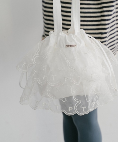 ■デザインポイント・オーガンジー素材のフラワーモチーフが可愛らしいバッグ・TPロゴもポイントに・マチがしっかりあり、見た目以上の容量・肩掛けしやすいショルダーの長さ■カラー展開ホワイトブラックイエロー■THEATRE PRODUCTS(シアタープロダクツ)「洋服があれば世界は劇場になる」をコンセプトに2001年設立。エレガントで女性らしいウエアと、ユーモアとウィットに富んだアクセサリーなどをとおして、ファッションブランドにおきるすべての出来事を舞台にあげてスポットライトを当てる。 デザイナーを武内昭と森田美和が務める。