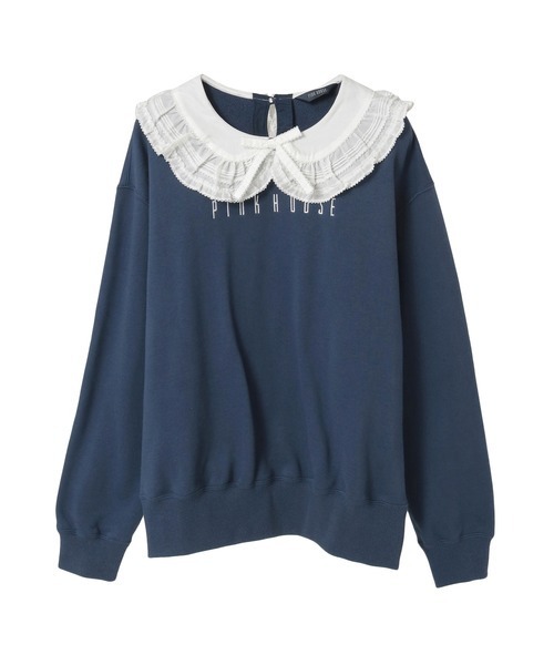ピコフリルにピンタックをあしらった真っ白なローンの衿の付いた可愛らしさ溢れるトレーナー。丸みを帯びた清楚で可憐なローン衿は、どのカラーにも真っ白な衿が付いていて、なかにローンのブラウスを重ねて着なくても着ている風にみえるレイヤードタイプ。さらりと1枚で着ても可愛く着られます。衿もとからは、シロ色のPINK HOUSEのロゴ刺繍がのぞきます。身ごろには、程よい厚みの30/10裏毛素材を使用。表面にはやや細目の30番手の糸を、裏面の裏毛部分には10番手の太い糸を使用しており、 裏毛部分も綺麗に整っており天然素材コットン100%の暖かさを感じられるとても着やすい素材感。裏起毛ではないので通年通してお楽しみいただけます。